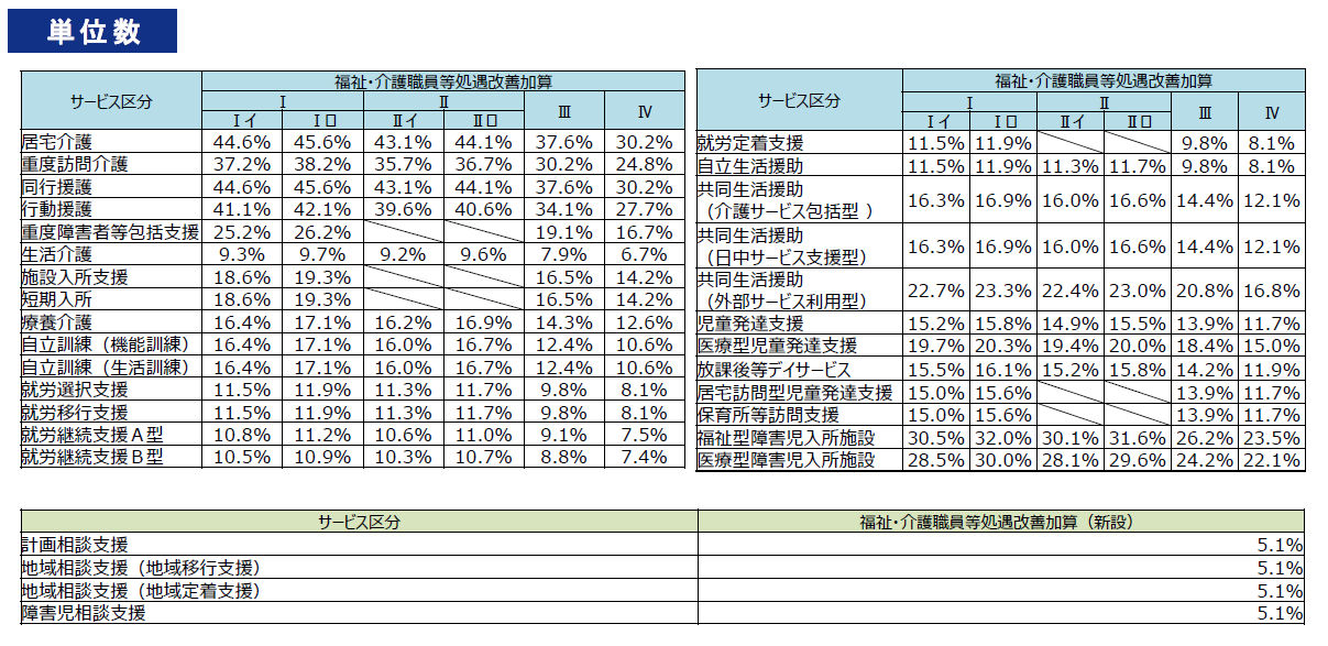 ※これらの処遇改善加算の拡充は、令和8年(2026年)6月からの施行となります。また、これに連動して、訪問系サービス(居宅介護、重度訪問介護など)における市町村向けの国庫負担基準(上限単位数)も合わせて引き上げられます。