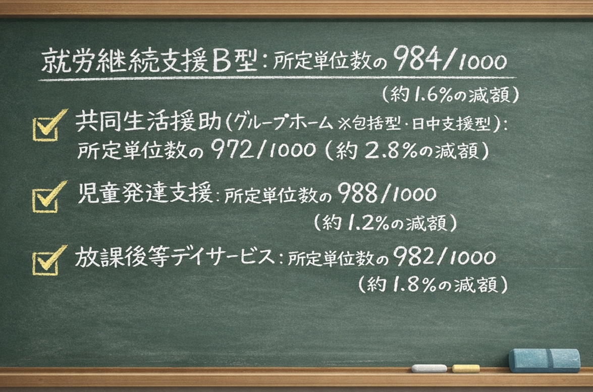 ・就労継続支援B型:所定単位数の 984/1000 (約1.6%の減額)