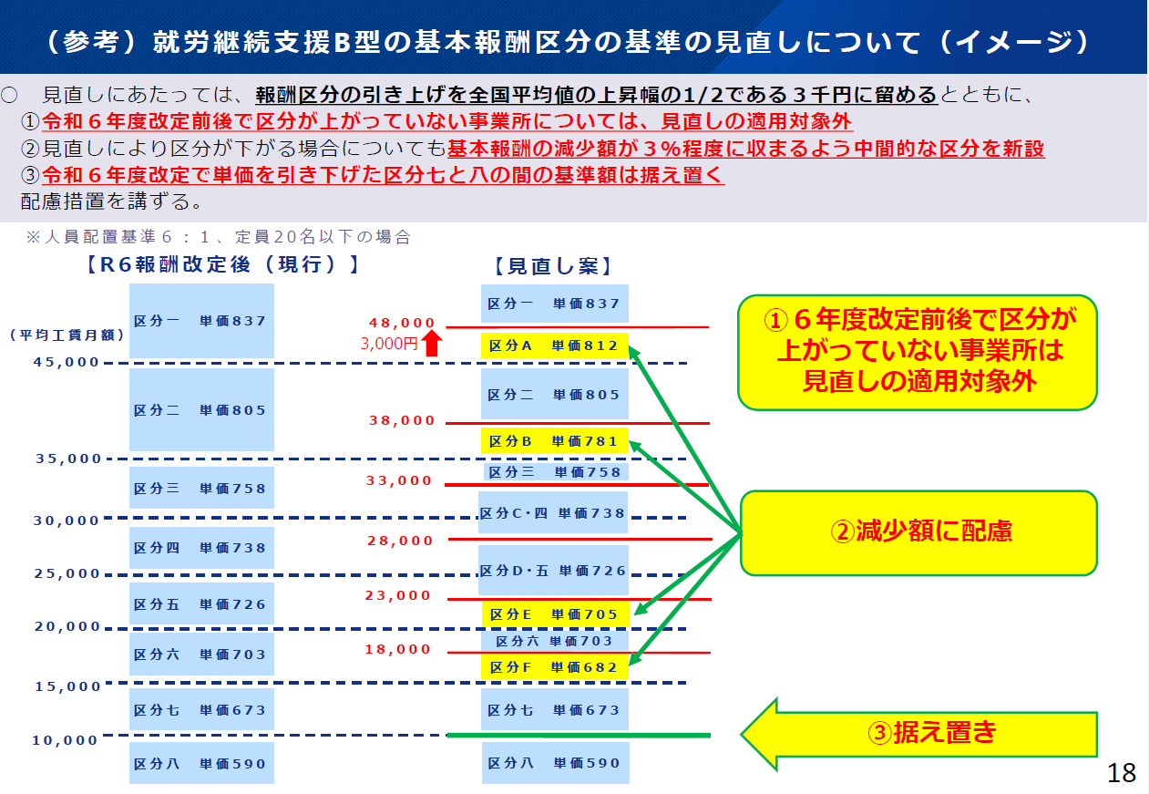・下がっても「減少は最小限に」:今回の基準引き上げによって、どうしても区分が「下がってしまう」事業所については、基本報酬の減少額が3%程度に収まるように「中間的な新しい区分」が特別に新設されます。