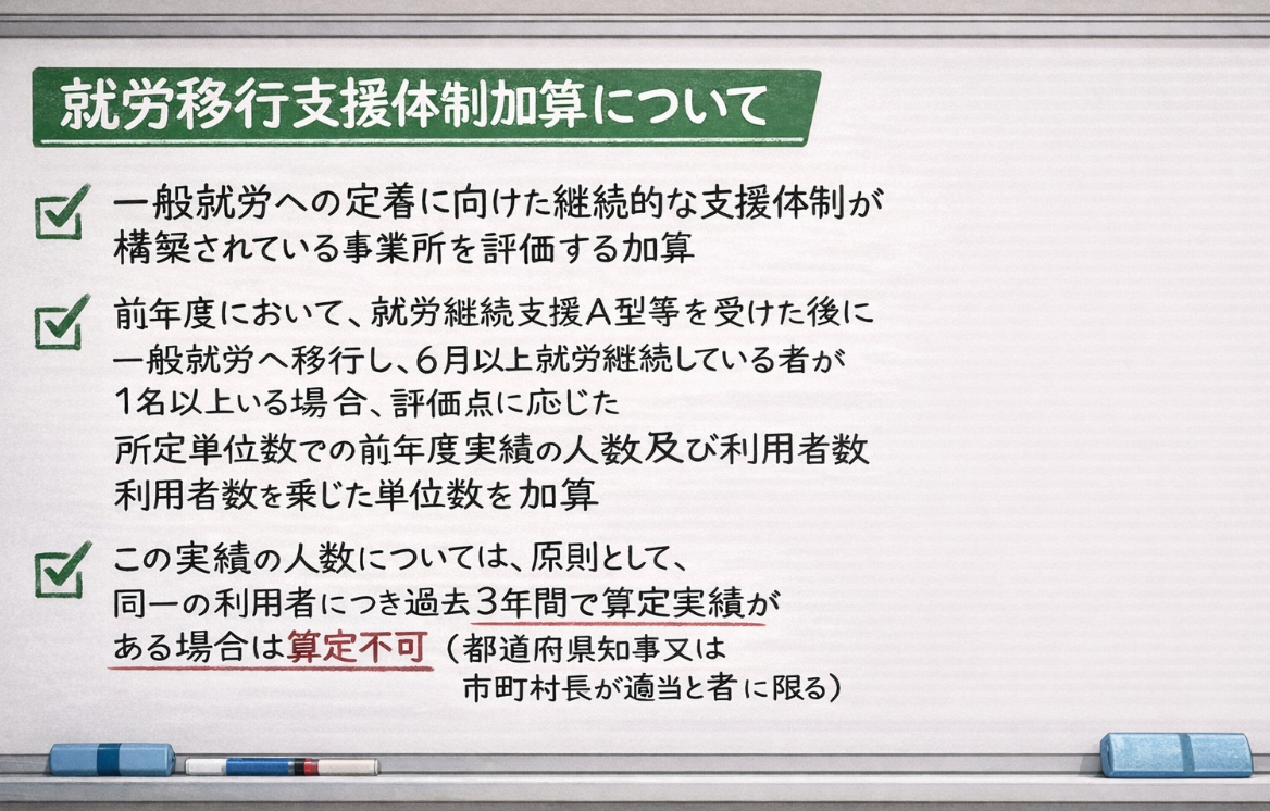 ・過去に算定した人は原則NG(3年ルールの明確化) 同じ事業所内での重複だけでなく、「他の事業所」も含めて過去3年間にこの加算の算定実績がある利用者については、原則として算定できないことが明確にされました。(※ハラスメントなど、やむを得ない事情で退職したと市町村長が認めた場合は、例外として算定可能です)。
