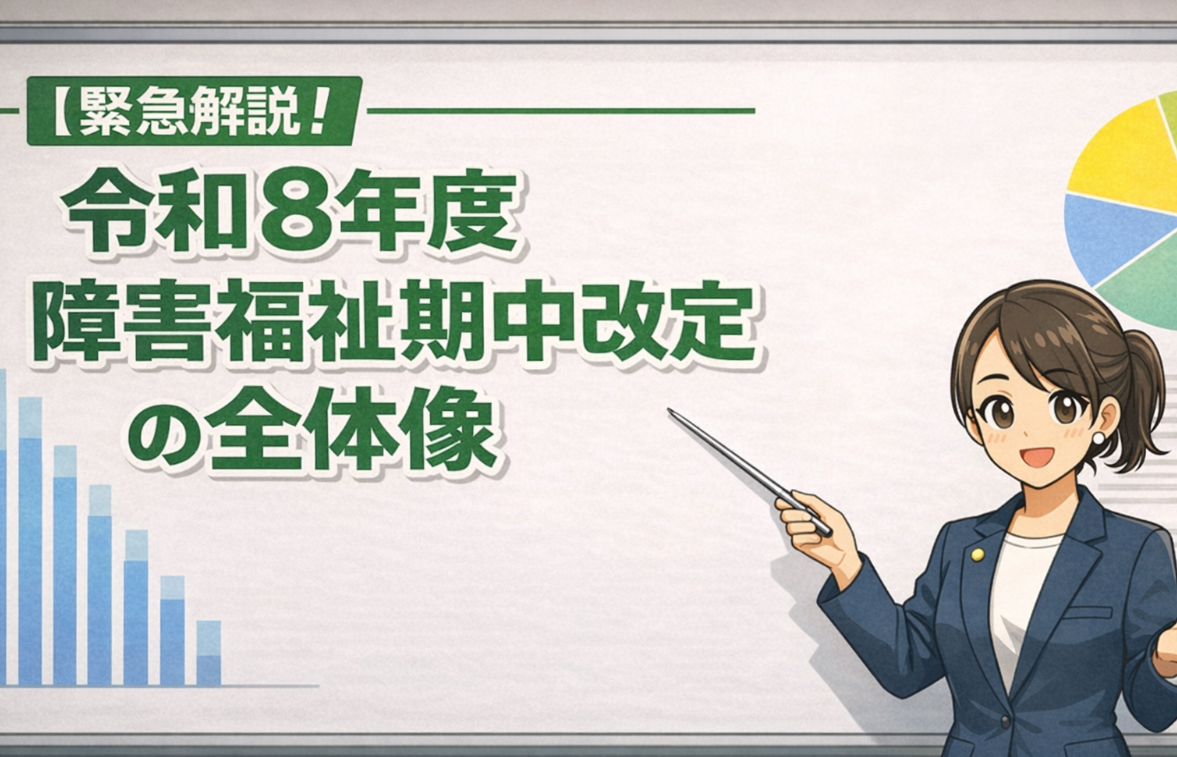 令和8年度(2026年)の障害福祉サービス報酬改定(期中改定)のポイントをわかりやすく解説。処遇改善加算の拡充、就労継続支援B型の見直し、新規開設への基本報酬調整など、事業所運営や開設に与える影響と対策を整理しました。