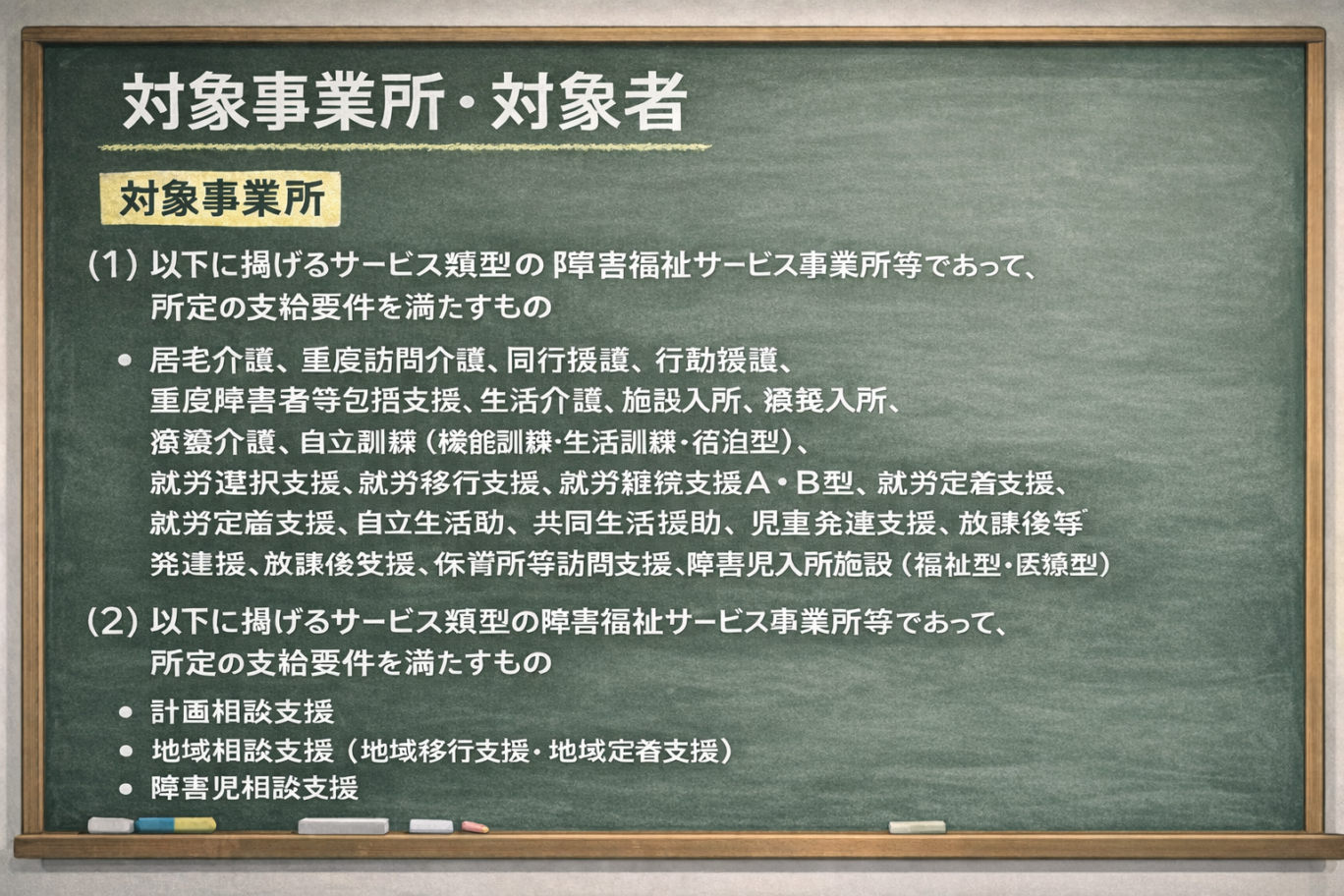 障がい福祉サービス事業所等の広範なサービスが対象です。