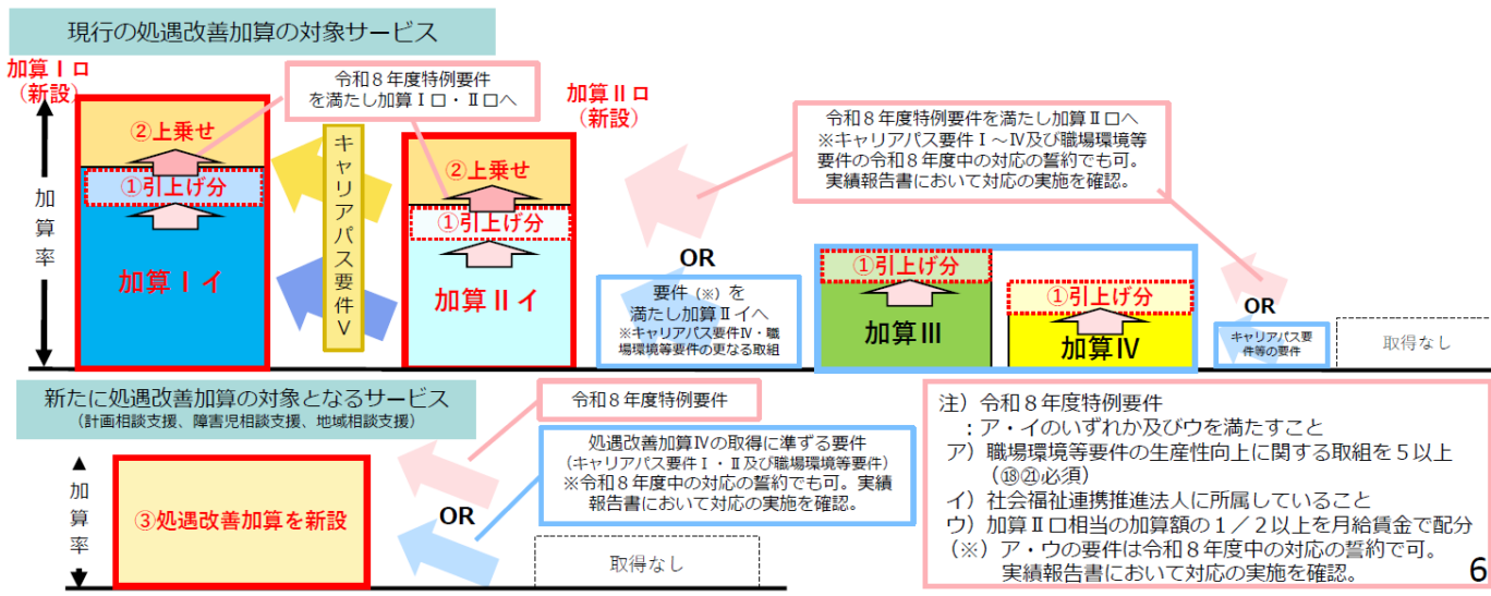 事業所様にとって一番気をつけたいのが、新しくできる「上乗せ加算(加算Ⅰロ・Ⅱロ)」をもらうための「令和8年度特例要件」です。 この特例要件をクリアするには、「アかイのどちらか」と「ウ」を満たす必要があります 。