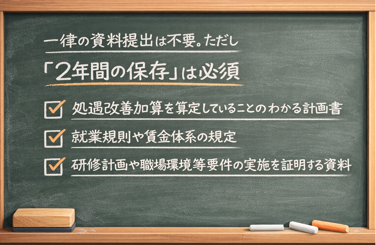 しかし、各事業所は以下の根拠資料を自ら備え、求められた際には速やかに提出できるよう「2年間保存」する義務があります 。