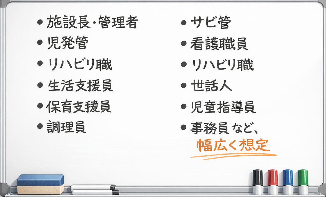 施設長・管理者、サビ管、児発管、看護職員、リハビリ職、生活支援員、世話人、児童指導員、保育士、相談支援専門員、調理員、事務員など、幅広く想定されています 。